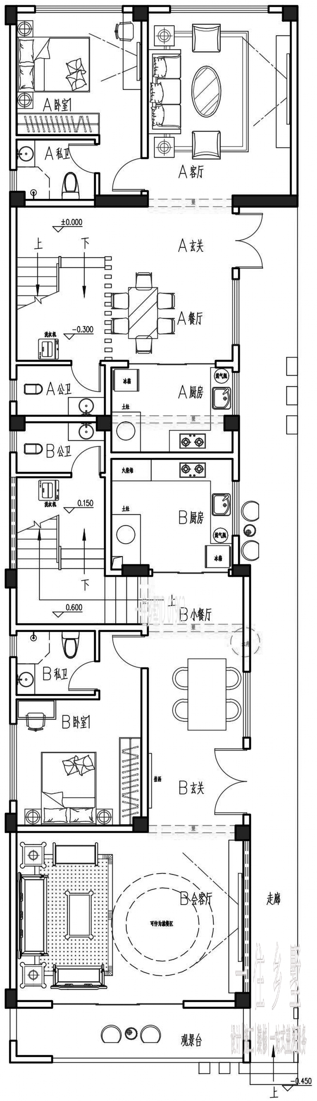 一層以2部分組成,通過中部獨立的廚房和樓梯劃分,整層共布置2間臥室,其中西北側的會客廳向外延伸出獨立的觀景平臺,使得居住者日常出行更加便捷。