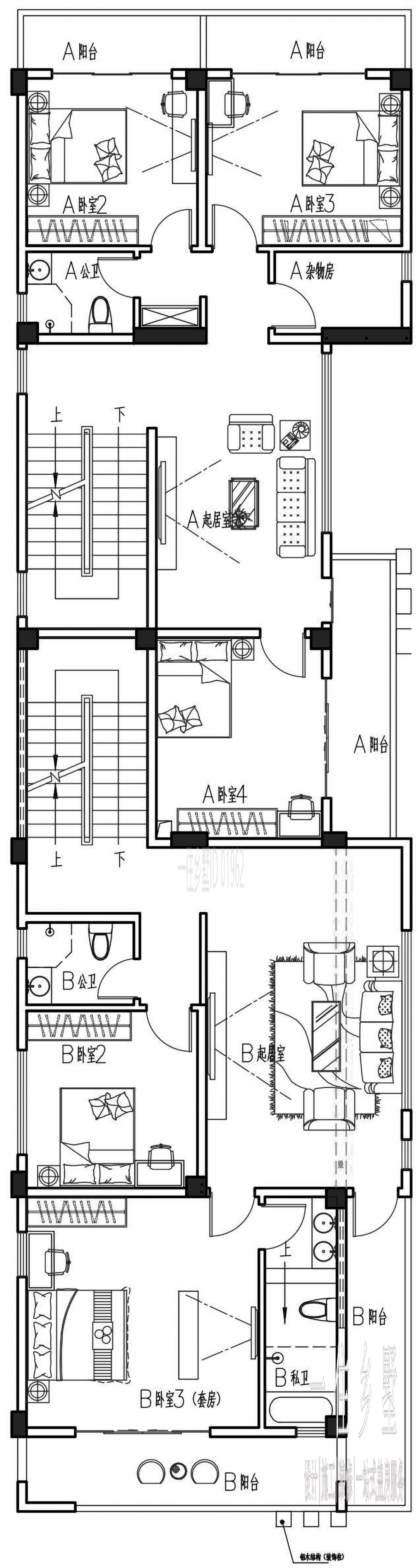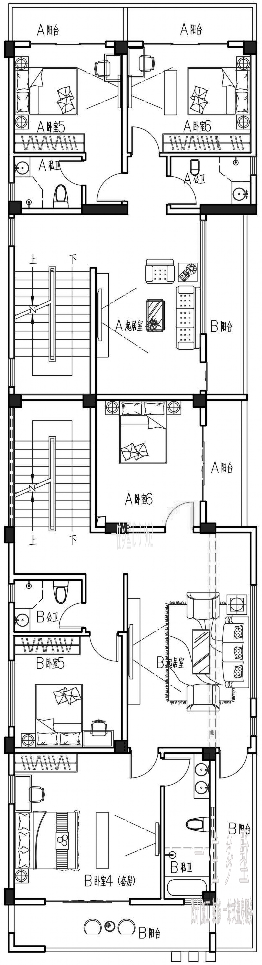 二、三層均以居住休閑功能為主,均布置5間臥室,其中西北側的臥室套房,搭配干濕分離的獨衛和陽臺使用。