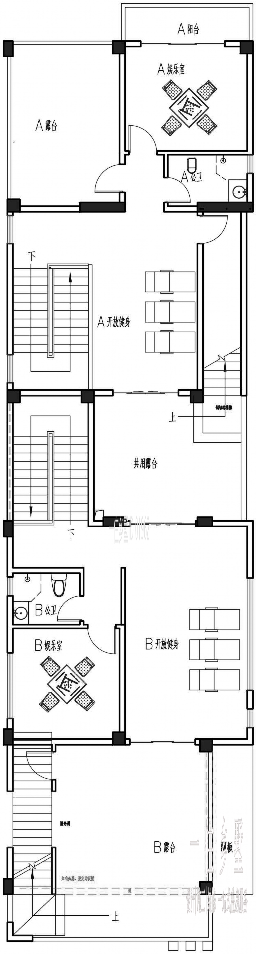 四層以娛樂休閑為主,中部預留大面積的娛樂室和開放式健身區,西側的廣角露臺使用,既提升室內的采光效果,又豐富整體的室外休閑功能。