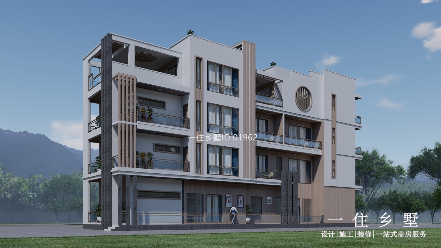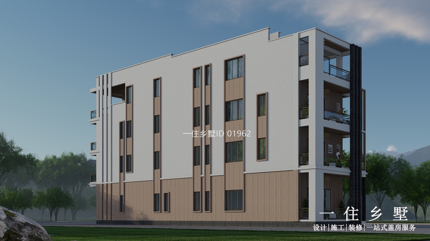 建筑為現代風格,設計師通過底部的深色的設計增強空間感;在材質上以淺色真石漆為主,搭配原木色塊和深色窗框,增強了建筑整體的視覺沖擊。